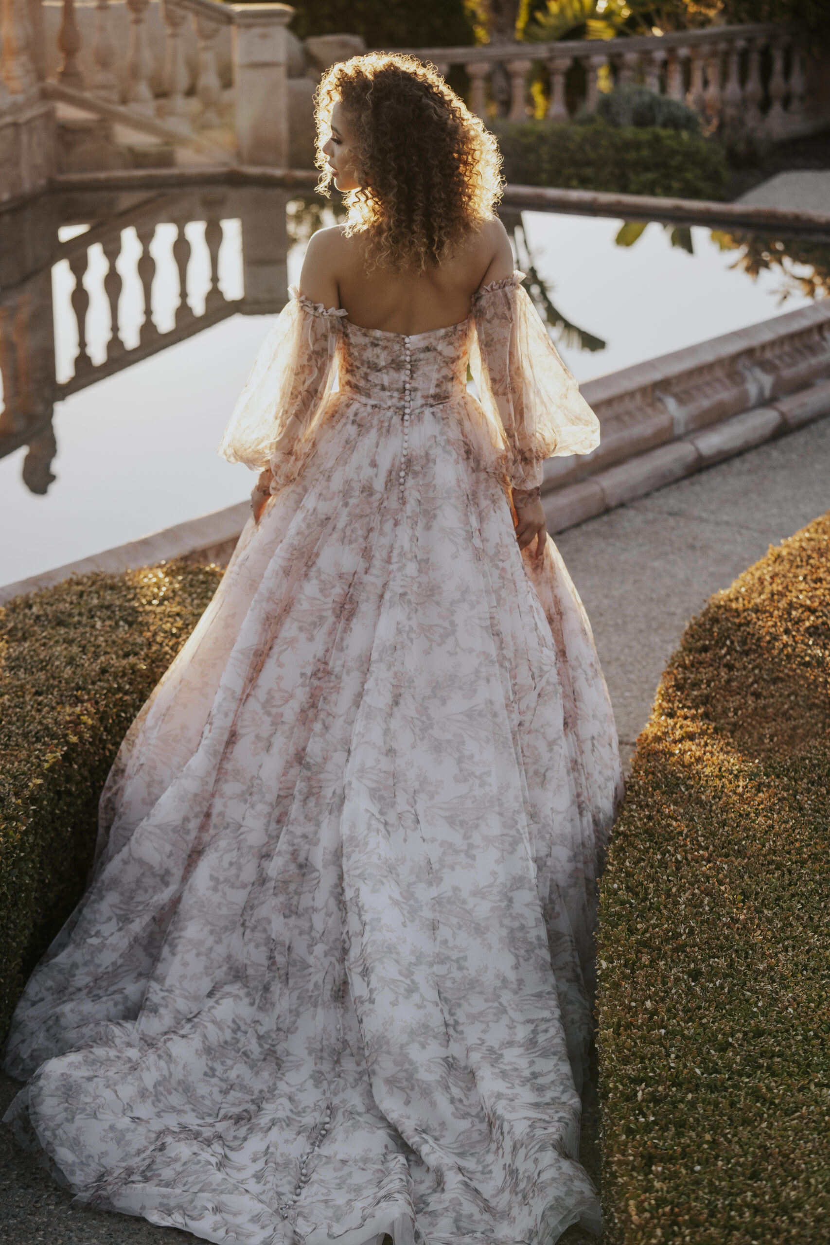 Allure bridals A1150 elegantly puffed detachable tulle sleeves echo the subtle rose floral print seen throughout this show stopping tulle ballgown.