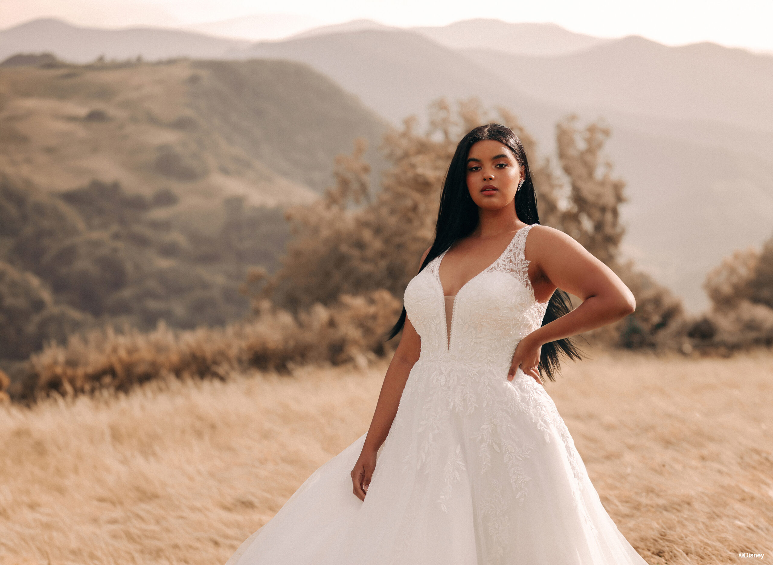 Inspired by the untamable wind and myriad textures of nature, the Disney’s Pocahontas-inspired ballgown features lace illusion straps leading to a deep V-back. Tonal appliqued leaves adorn the gown throughout.