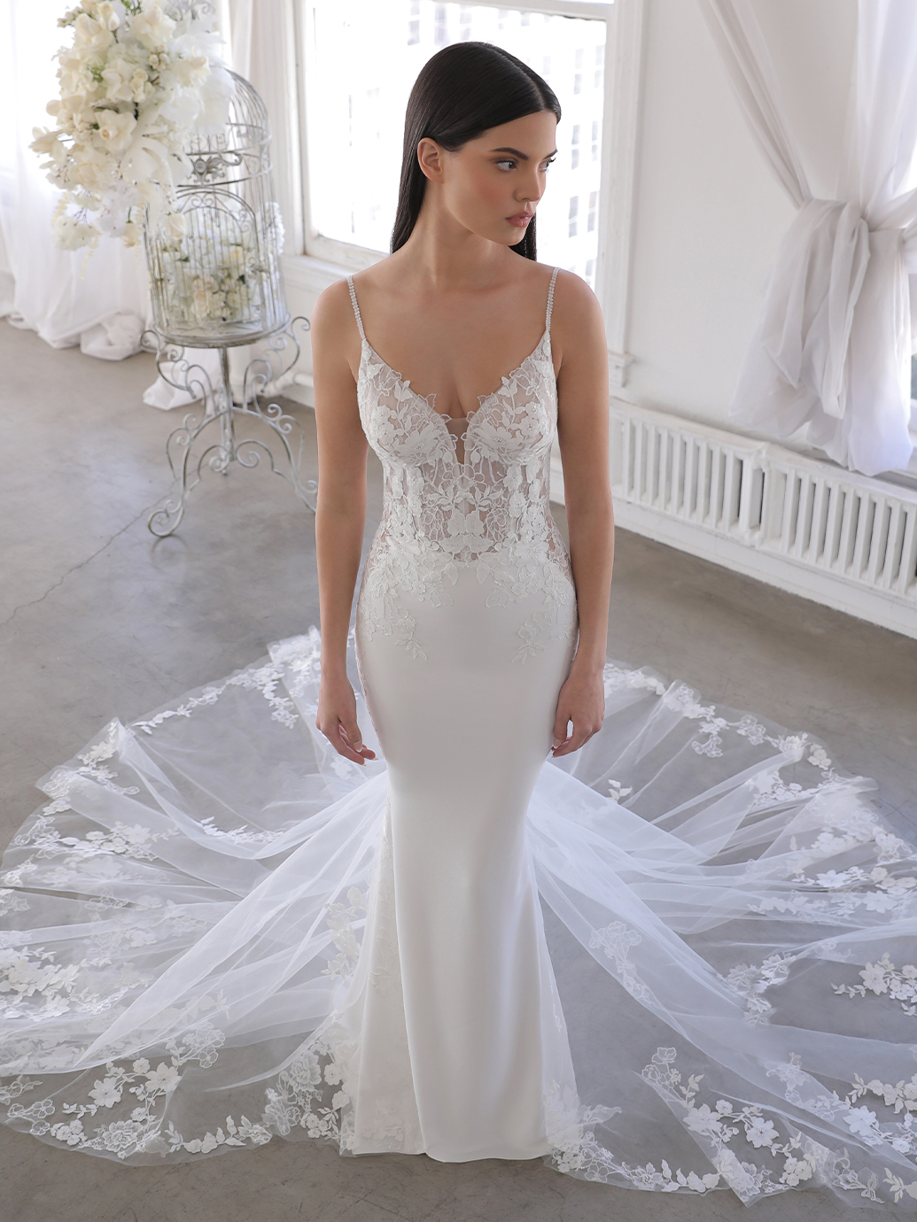 Blue by Enzoani Opal is spectacular for it’s details for this sweet and stunning mermaid gown. Delicate floral embroidered lace creates dimension and softness on the sexy plunging sweetheart neckline bodice and trails down into the sleek stretch georgette skirt. Thin spaghetti straps help support a gorgeous low illusion lace back. This romantic look is complete with a dramatic tulle statement train sprinkled with lace appliques.