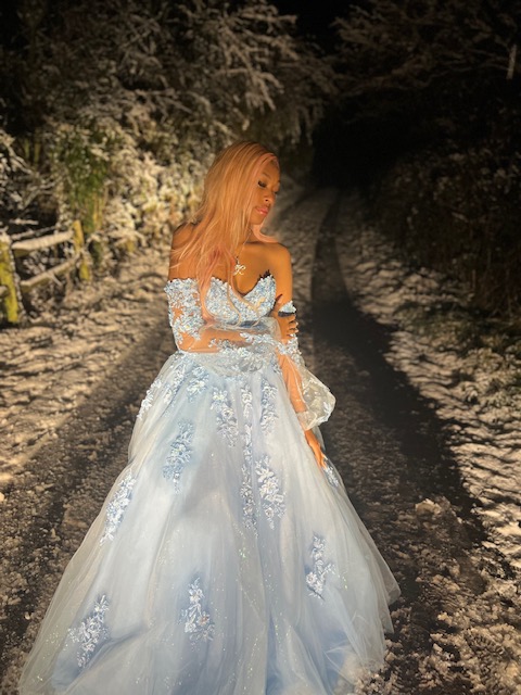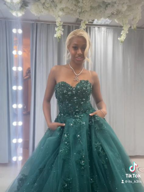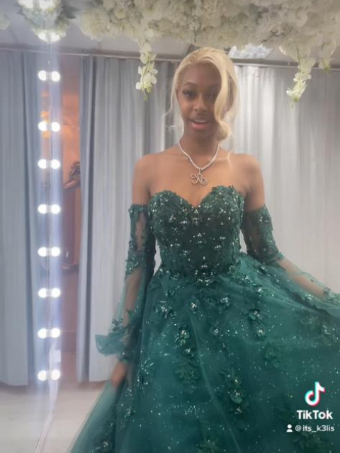 Princess A-line prom dress with a corset lace up back. The sleeves are completely detachable. Available from size 0-24