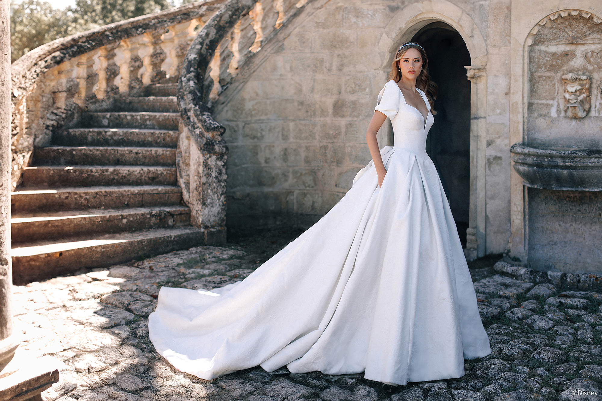 D433 – Cinderella – Allure Bridals This breathtaking ballgown brings Cinderella’s timeless tale to life. Featuring a romantic sweetheart neckline and a basque waist that adds a regal touch, this dress captures the essence of a dream come true. The elegant brocade print adds texture and depth, while detachable puff sleeves offer versatile style, allowing the bride to create her own fairytale look. Available with both corset and zipper back options, this gown is crafted to fit each bride’s unique vision. With options in both Platinum and Ivory, this gown is perfect for a bride who, like Cinderella, believes in the power of dreams, love, and a little magic.