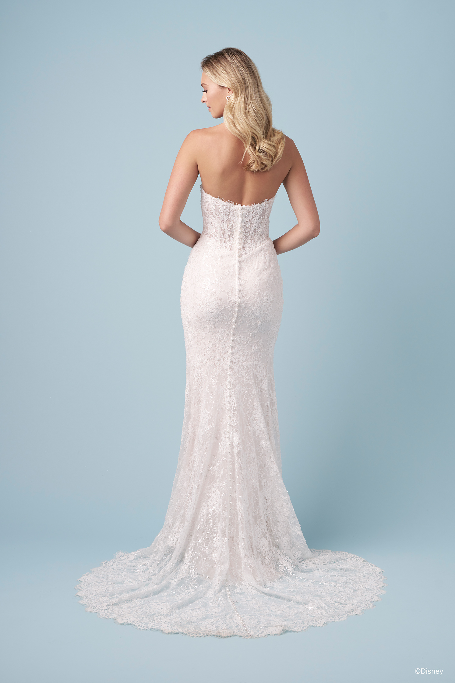 D477 Snow White Allure Disney Fairytale princess Inspired by Snow White’s gentle grace and timeless elegance, this sequined lace gown tells a story of romance and enduring love. The basque waist flatters the figure, while a slit adds a modern touch to the classic silhouette.