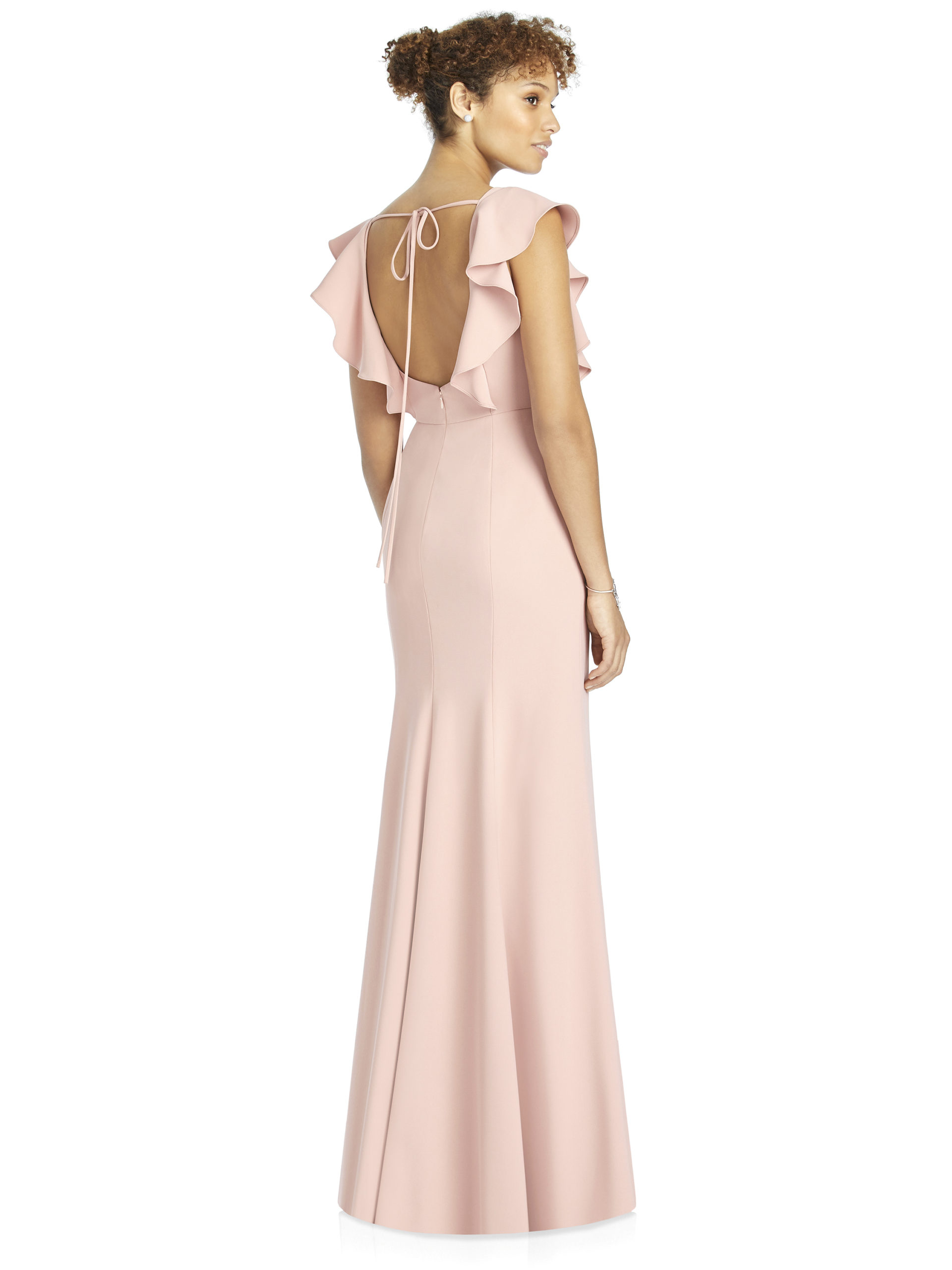 Dessy Bridesmaid 4539 dress is from the Dessy studio design collection. Dessy 4539 has a ruffle cap sleeve, bateau neckline and a low back. The dress securely ties on the back shoulders and falls into a trumpet skirt. Dessy 4539 is made of crepe fabric available in over forty other colour options.