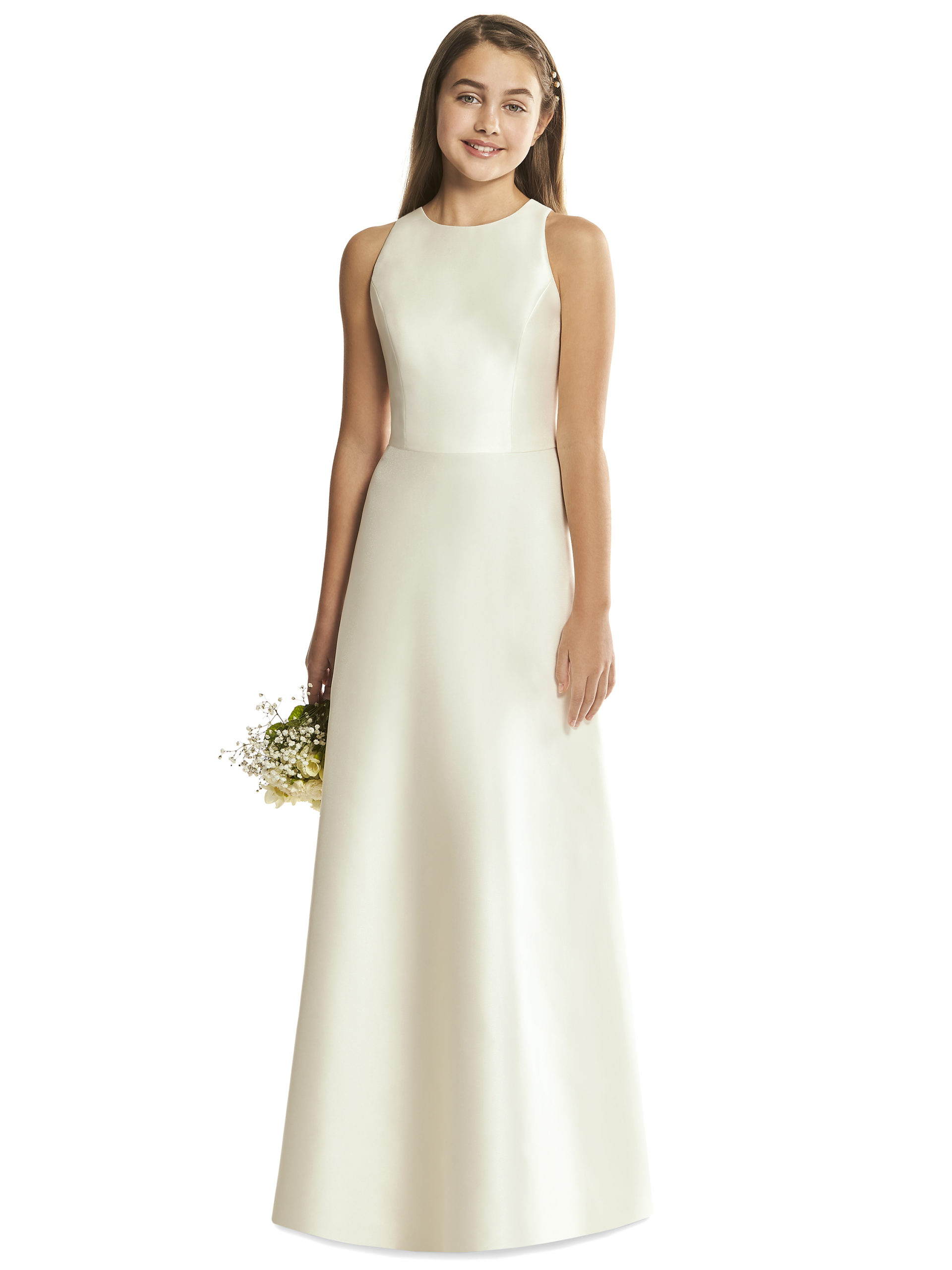 Dessy Junior JR545 Alfred Sung Bridesmaid dress is a full-length sleeveless satin-twill dress with a jewel neckline and a diamond cutout open back. This dress has pockets at side seams. Has a matching adult dress.