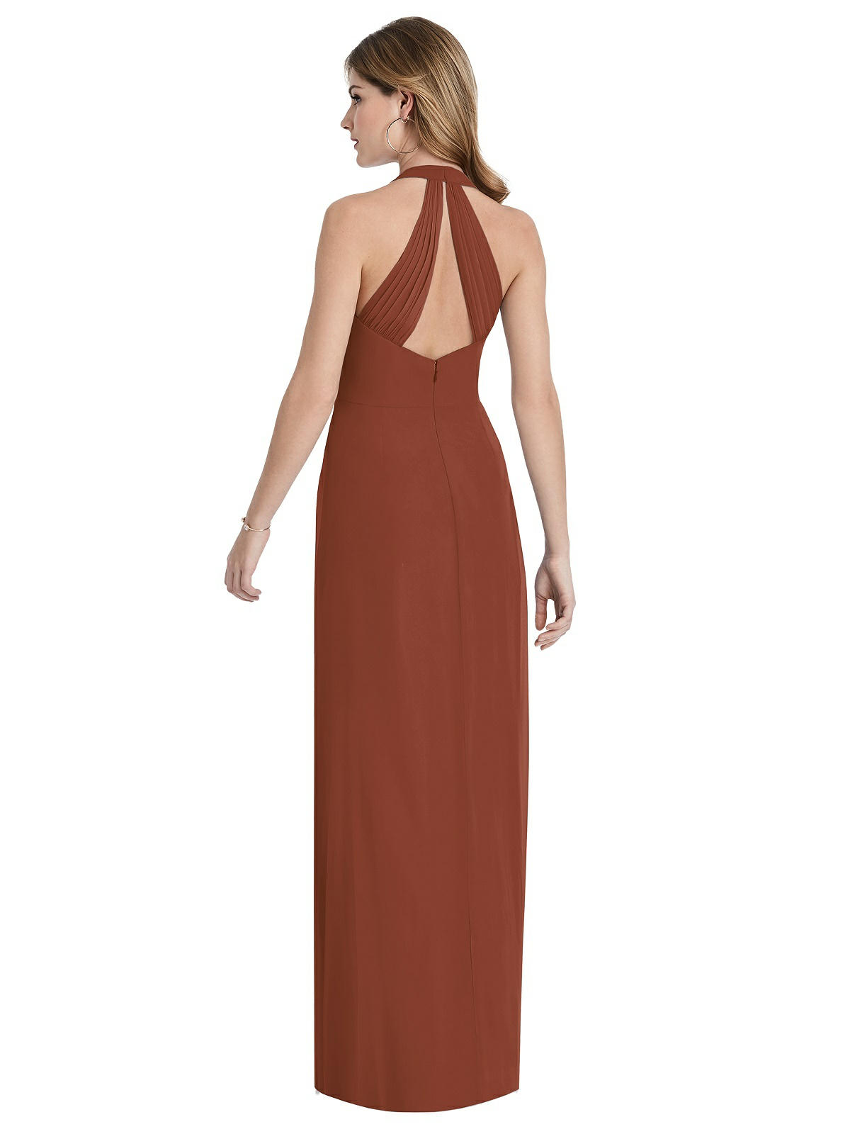 Dessy TH029 Bridesmaid Dress is a full length lux chiffon halter neck dress. Its modified V-neck offers just enough coverage. The back is a gorgeous pleated two straps split in a V-Shape. Contact our bridal shop to view and try this dress on.