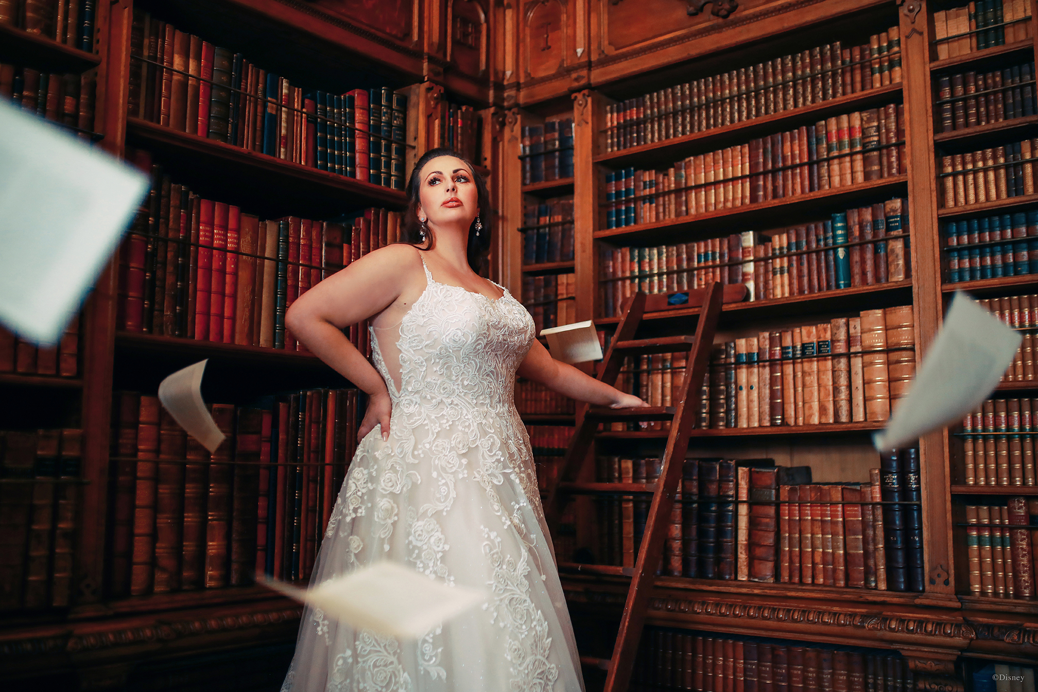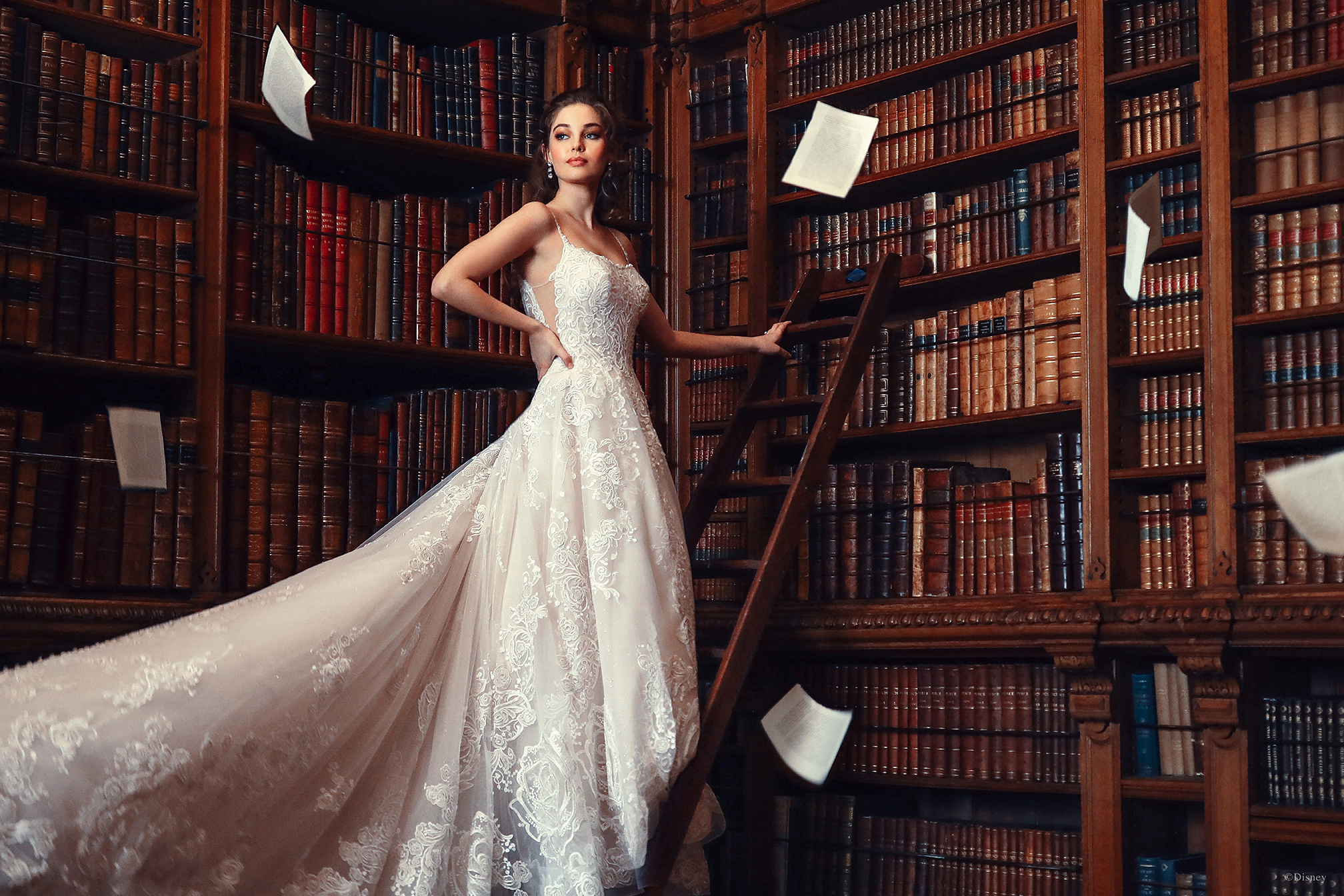 Disney Fairy Tale Wedding D282 Belle-inspired gown was designed to celebrate the 30th anniversary of Disney’s ‘Beauty and the Beast’. Rose motifs ‘dance’ across the ballgown. An embroidered lace overlay tops the tulle gown, finished with an illusion back and structured hemline to emphasize the beauty of the rose-covered train.