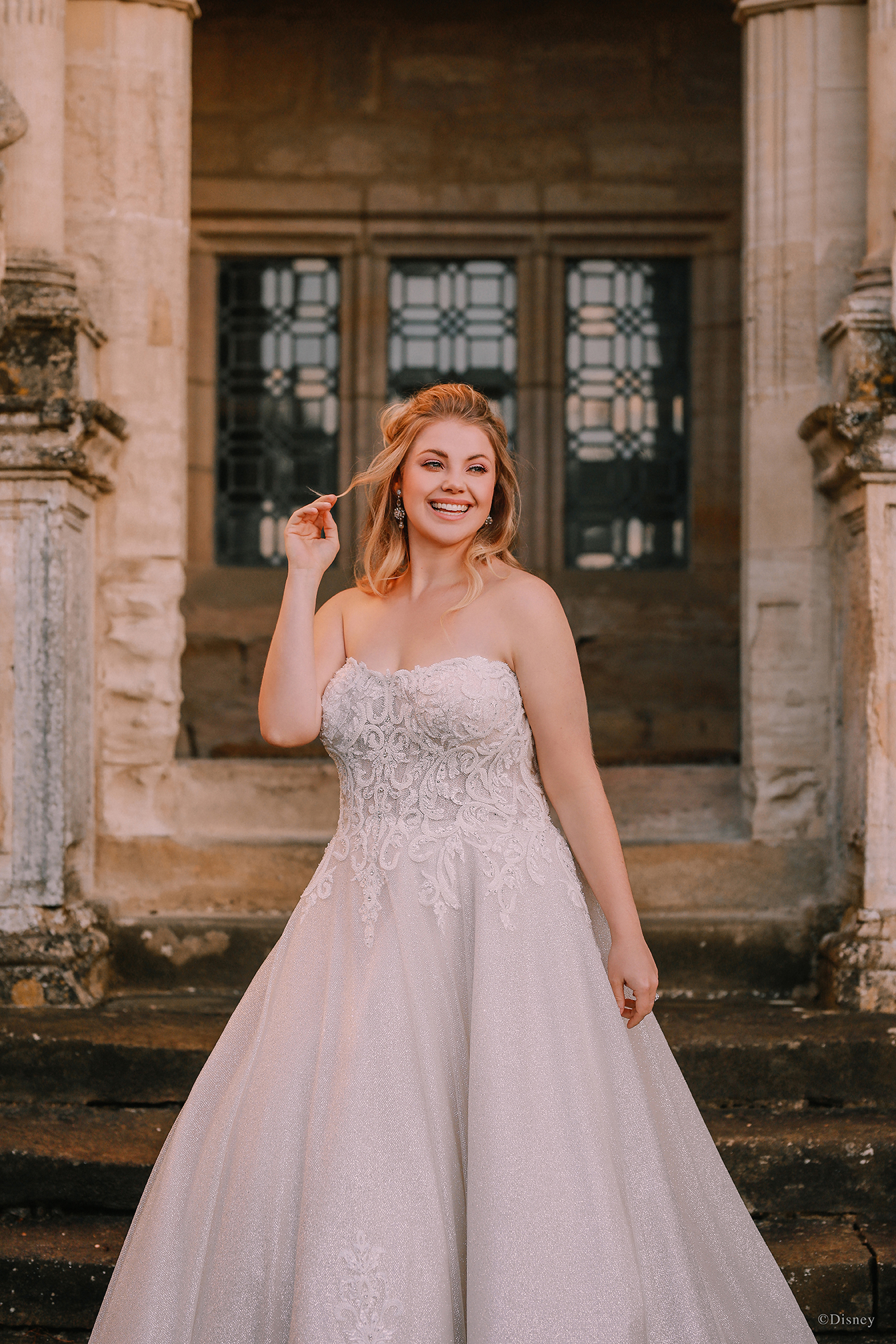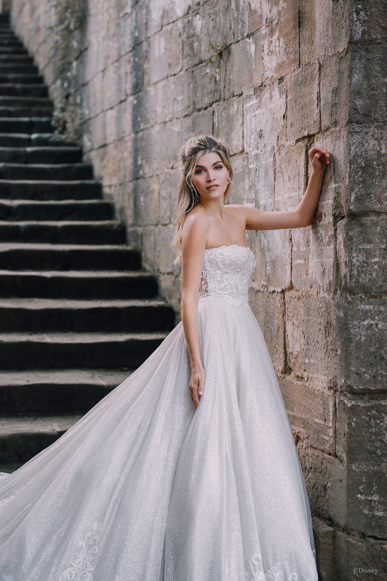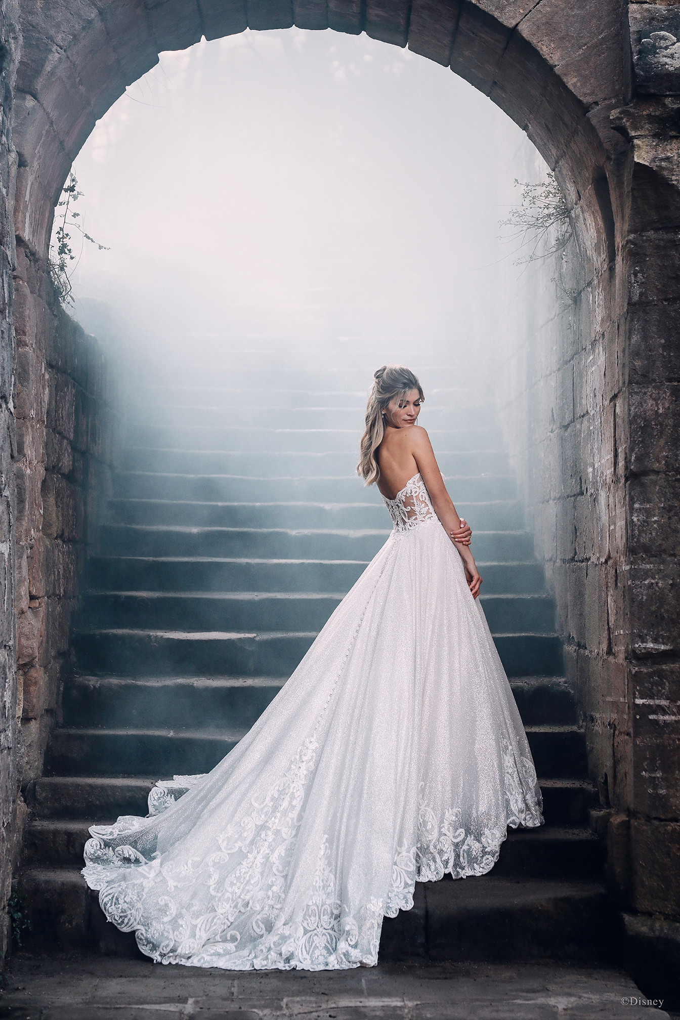 Disney Fairy Tale Weddings Cinderella D293 One enchanted evening, a fairy godmother transformed a gown into a work of art. This A-line gown features scrollwork inspired by the intricate details of Cinderella’s magic carriage, while sparkling diamond tulle twinkles in the light.