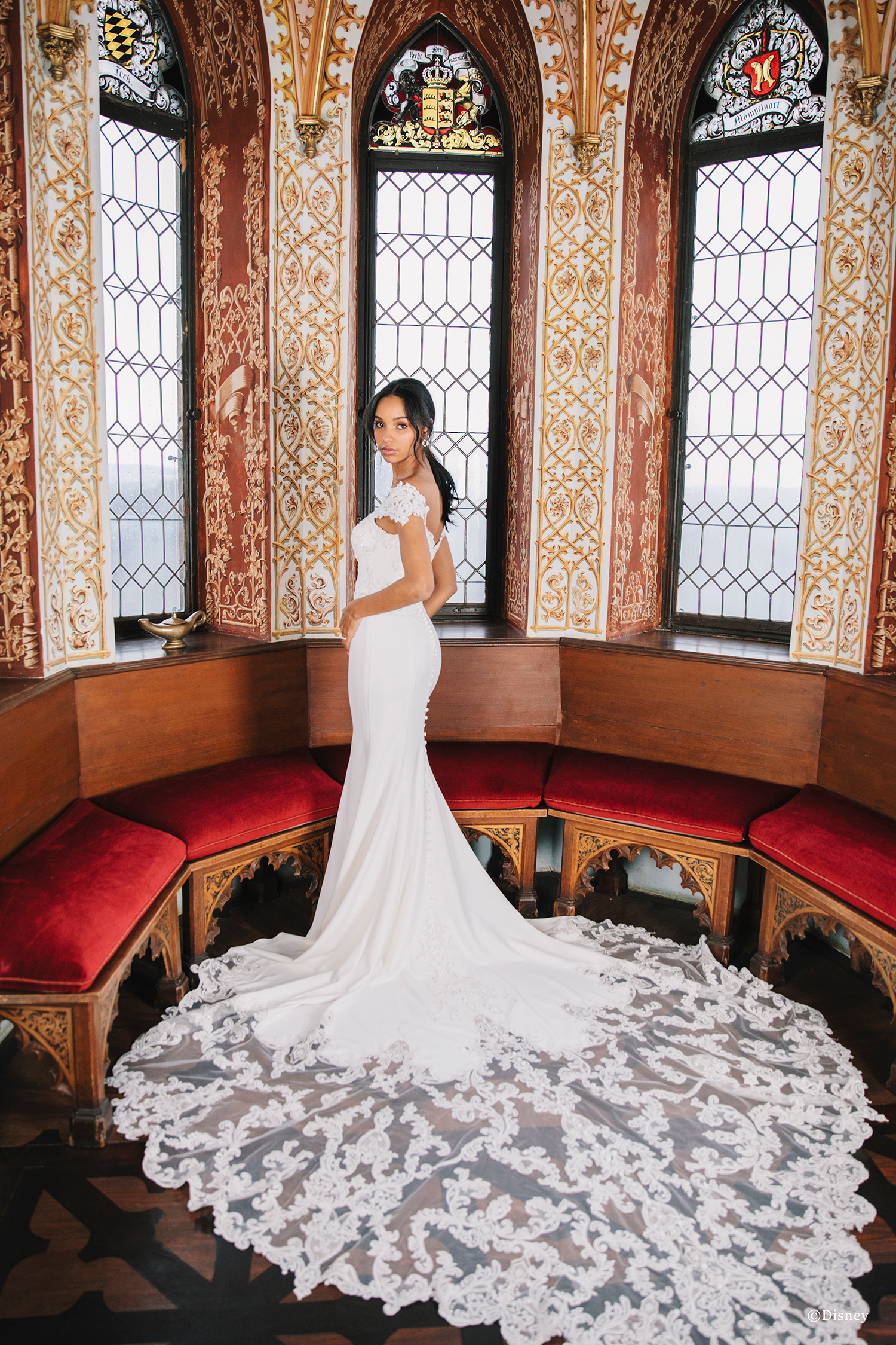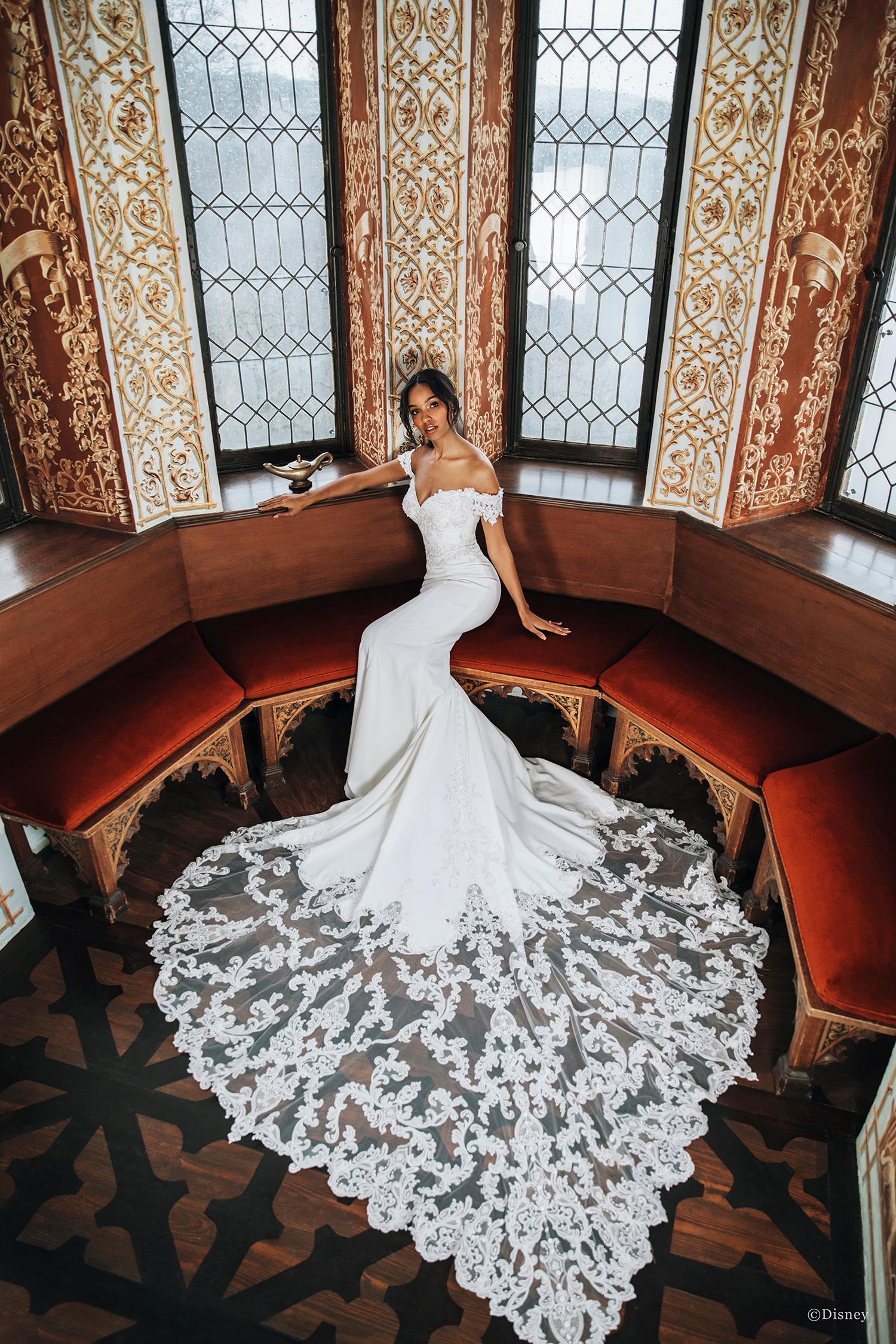 Disney Fairy Tale Weddings D264 Jasmine inspired gown calls forth royal elegance. Luxurious stretch crepe provides a flattering fit and flare silhouette with opulent Venise lace and crystals covering the stunning off-the-shoulder bodice. The unique and artistic design of the train is dramatic and memorable.