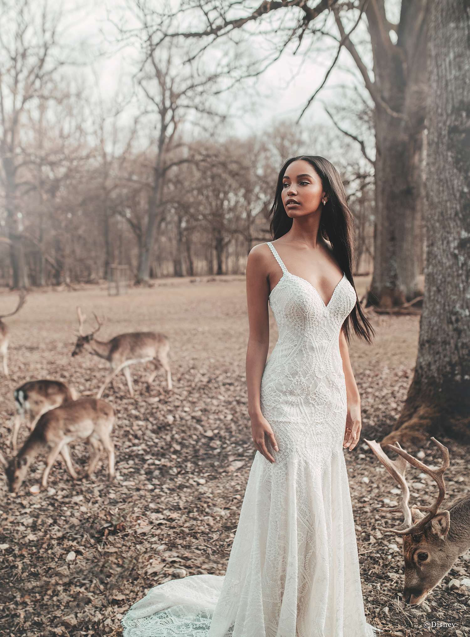 Our Pocahontas inspired gown is a beautiful and empowering silhouette. A sleek, slim design is layered in all-over cotton lace applique that features a stunning motif. Accented with a sweetheart neckline and detailed spaghetti straps this gown accentuates and flatters. The covered buttons down the back of the gown add another glamourous detail.