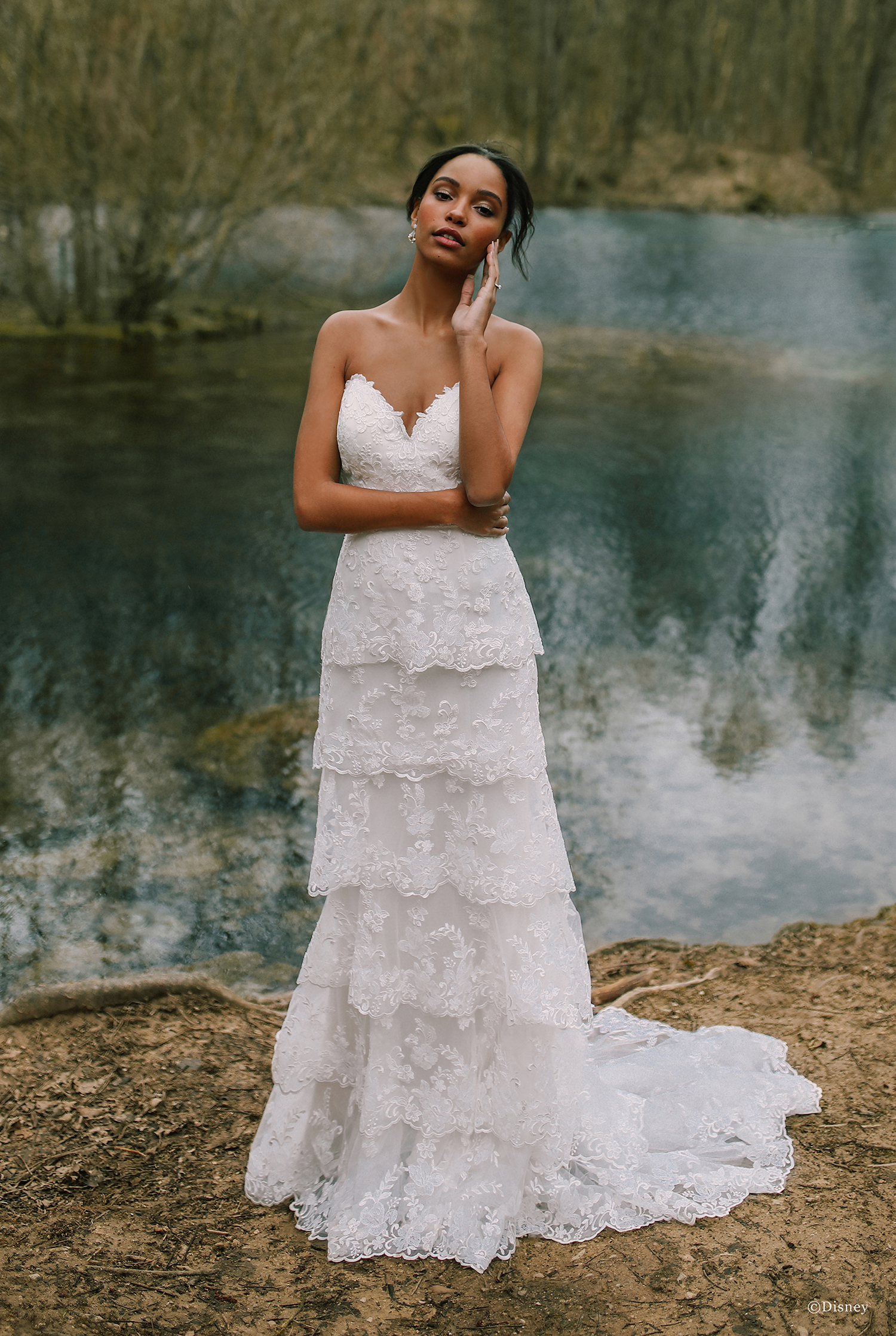 Disney Fairy Tale Weddings D268 Tiana-inspired gown evokes the opulence and elegance of the Jazz Age. The slender silhouette with a strapless, sweetheart neckline gives this dress a gorgeous and understated beauty. Delicate and sweet; tiers of soft tulle and Alencon lace cascade the length of this gown– very modern with vintage flair.