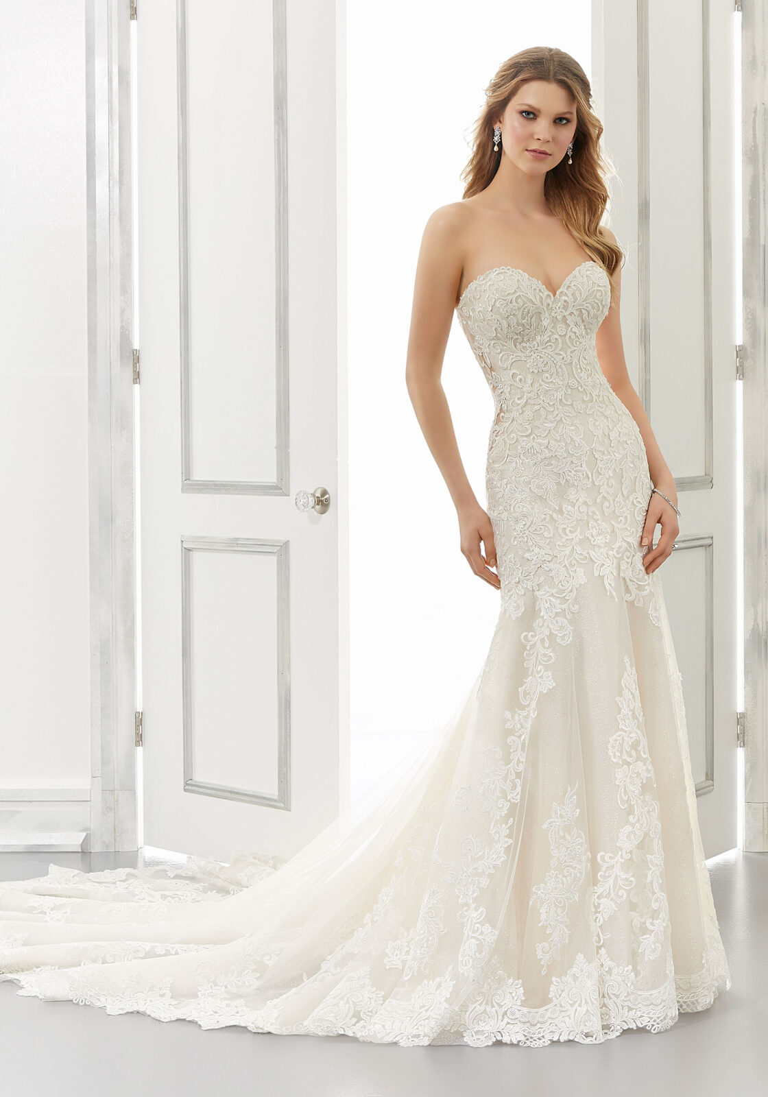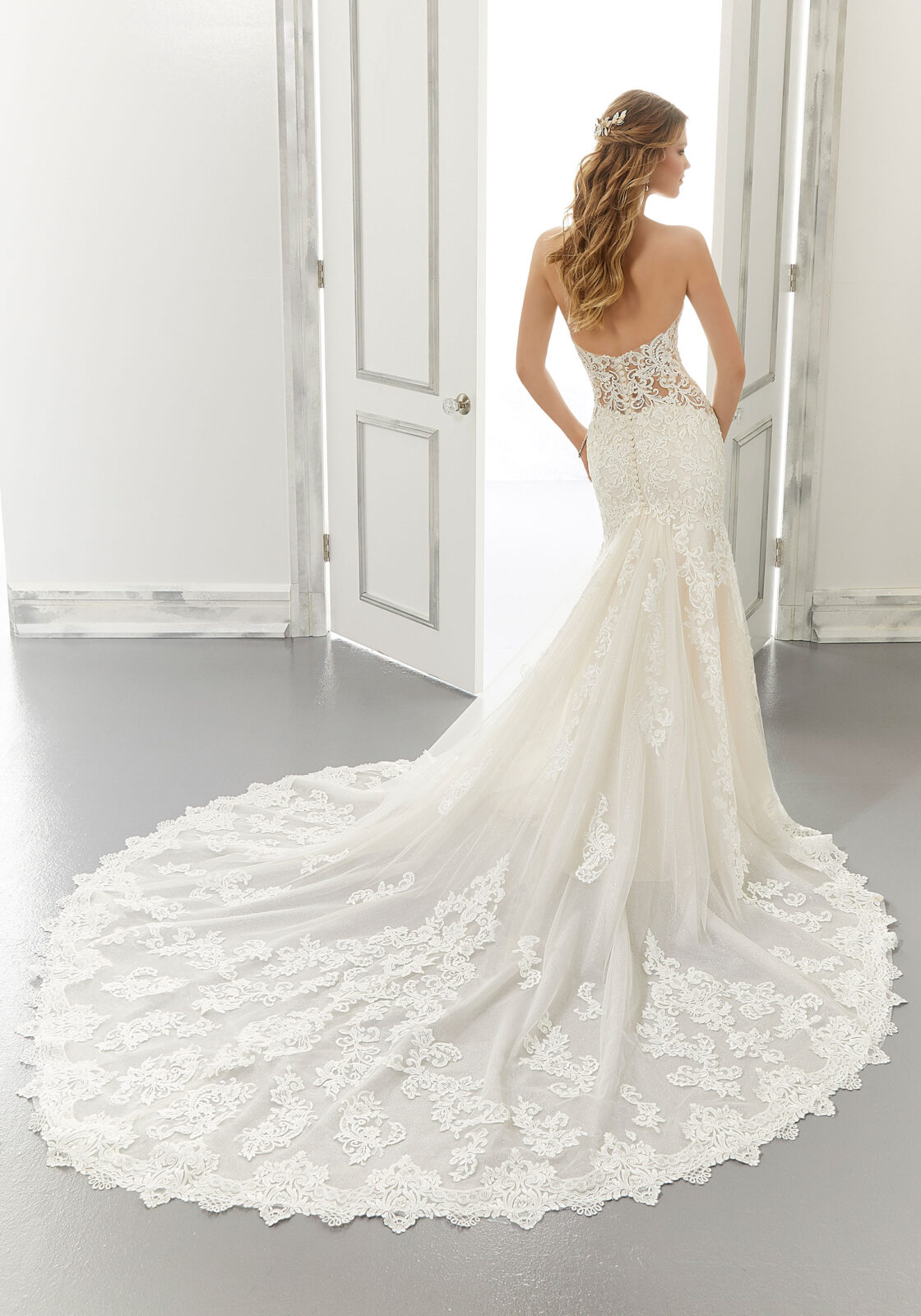 Morilee 2188 Wedding dress Allison is designed to flatter every curve. Allison wedding gown features a Tulle over Sparkle Organza high hip mermaid silhouette accented in frosted Alençon Lace appliqués. A wide scalloped hemline and sheer train complete the look. Beaded spaghetti straps are included for any bride who desires a strap.