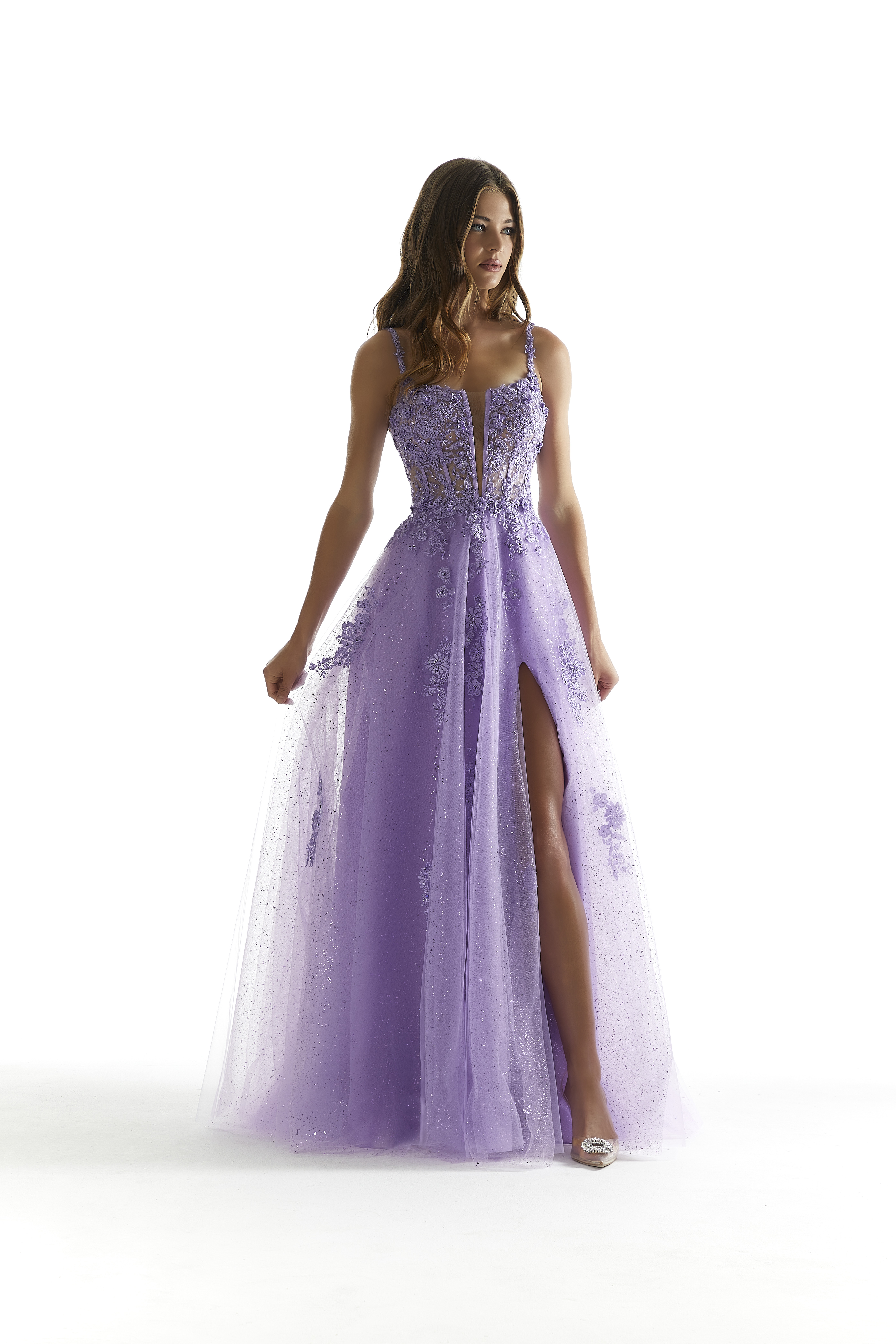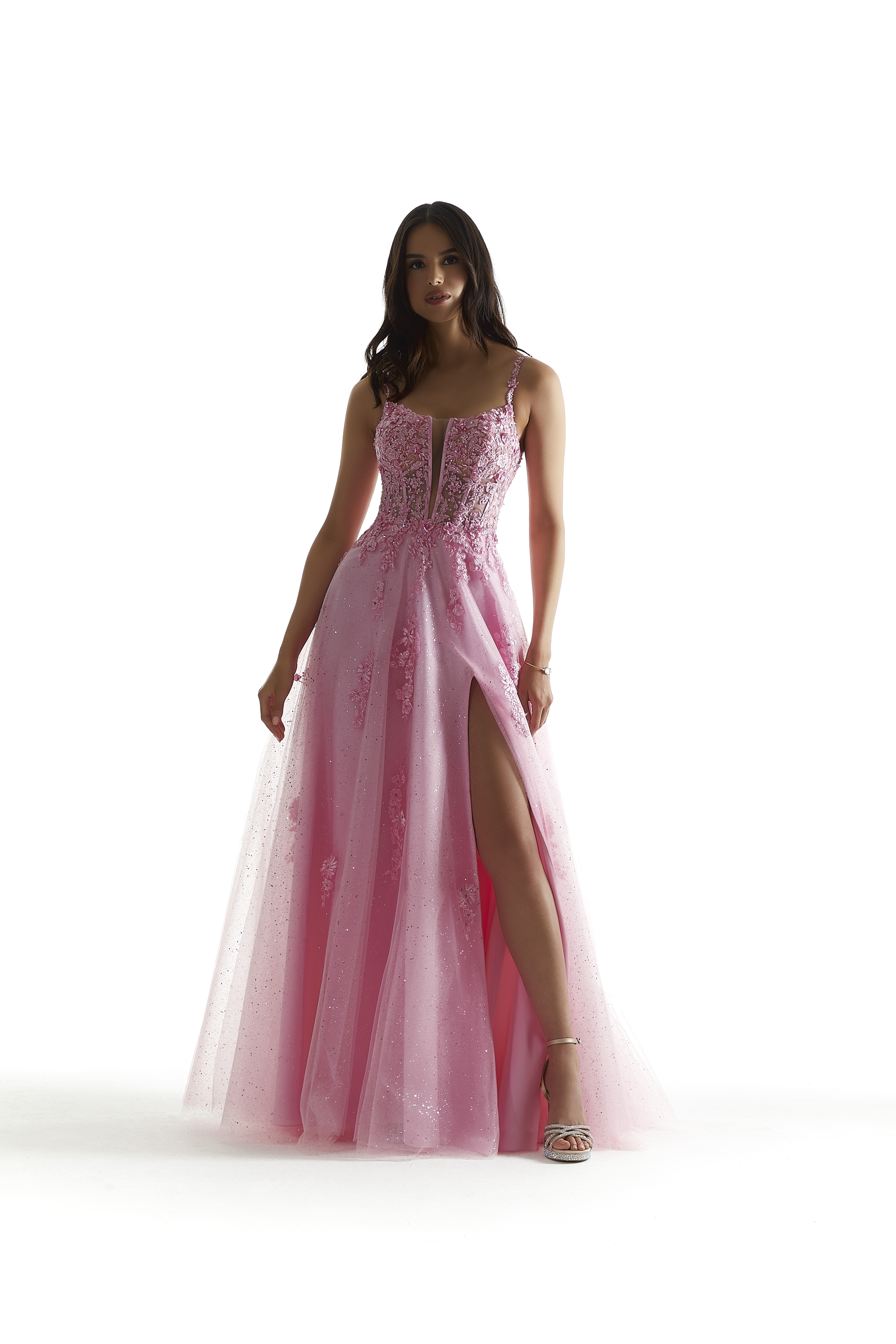 Ball gown prom dress with plunging scoop neckline and straps. Designed with love by Madeline Gardner.