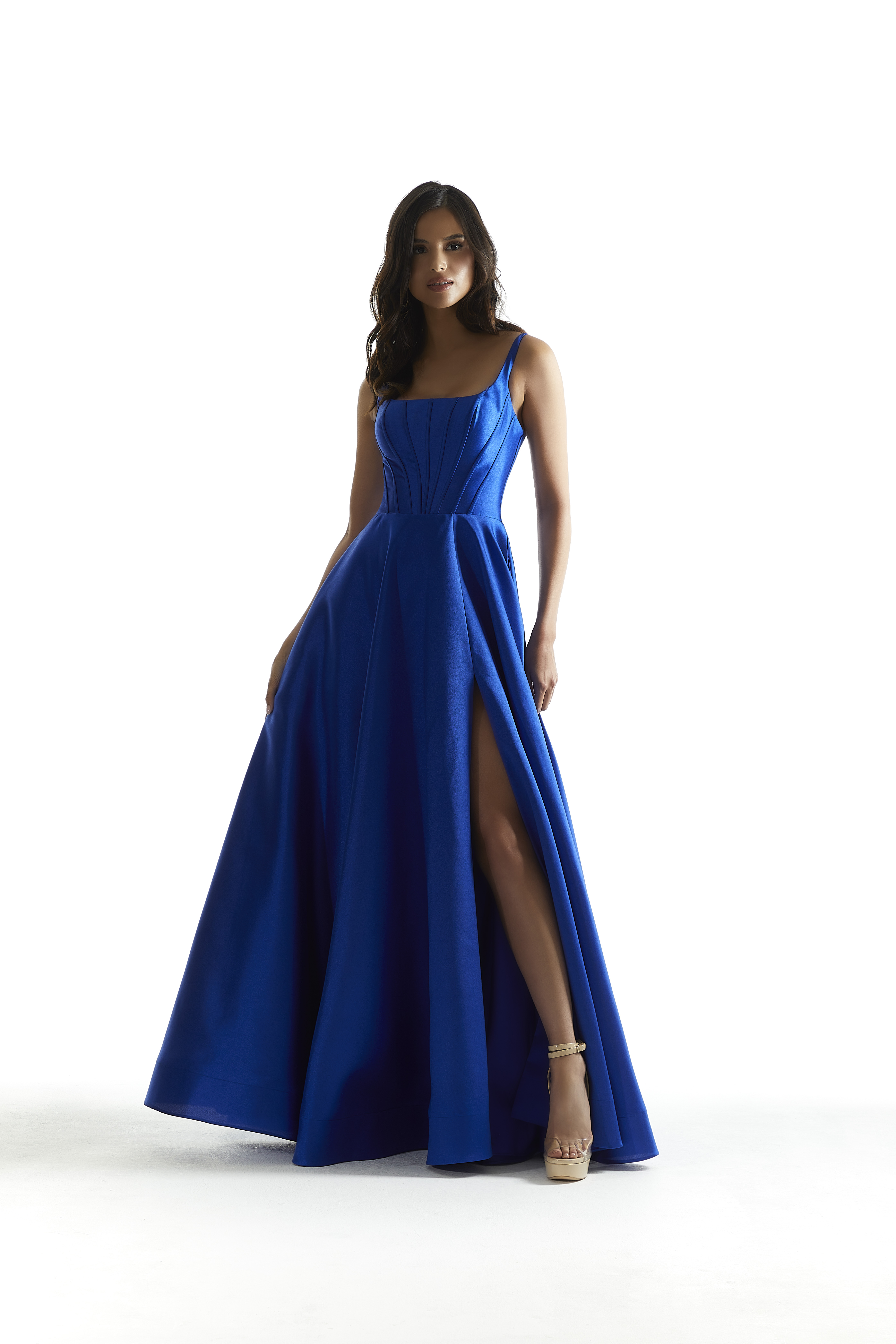 Classic prom dress has a square neck bodice with exposed boning on a flared A-line skirt in luxe matte Larissa satin.