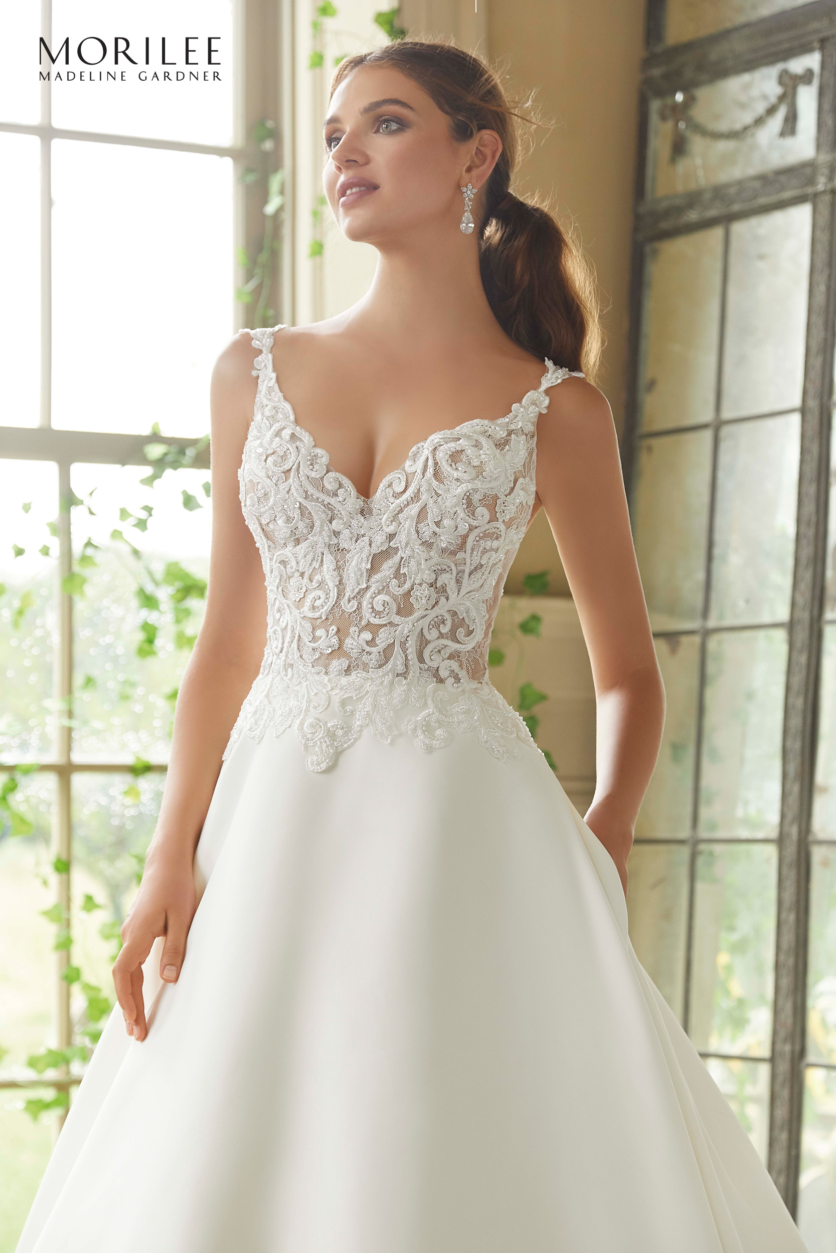 Morilee 5716 Wedding dress Petrova is a regal satin ball gown made in combination of Clear Crystal and Pearl Beaded, Embroidered Appliqués Over Chantilly Lace Bodice. The back has a low scoped opening.