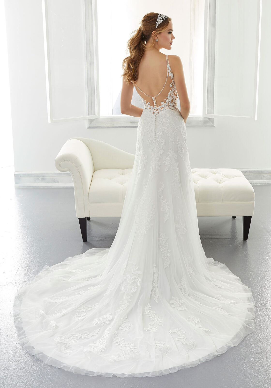 Morilee 5869 Wedding dress Asya is an A-Line designer wedding dress. Asya has a Crystal beaded detail trim along the V-neckline. It has delicate sheer straps leading to a gorgeous scooped, open back.