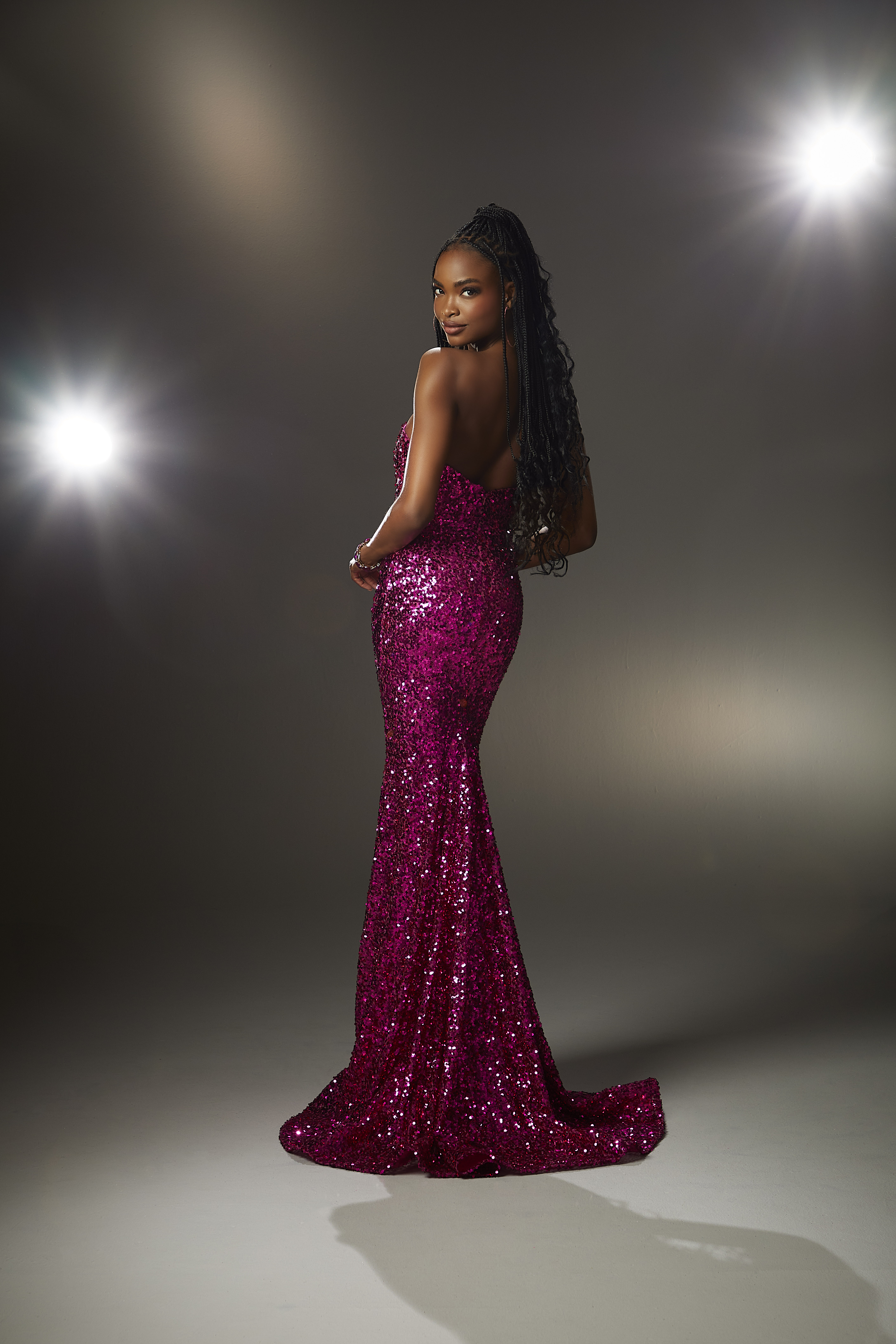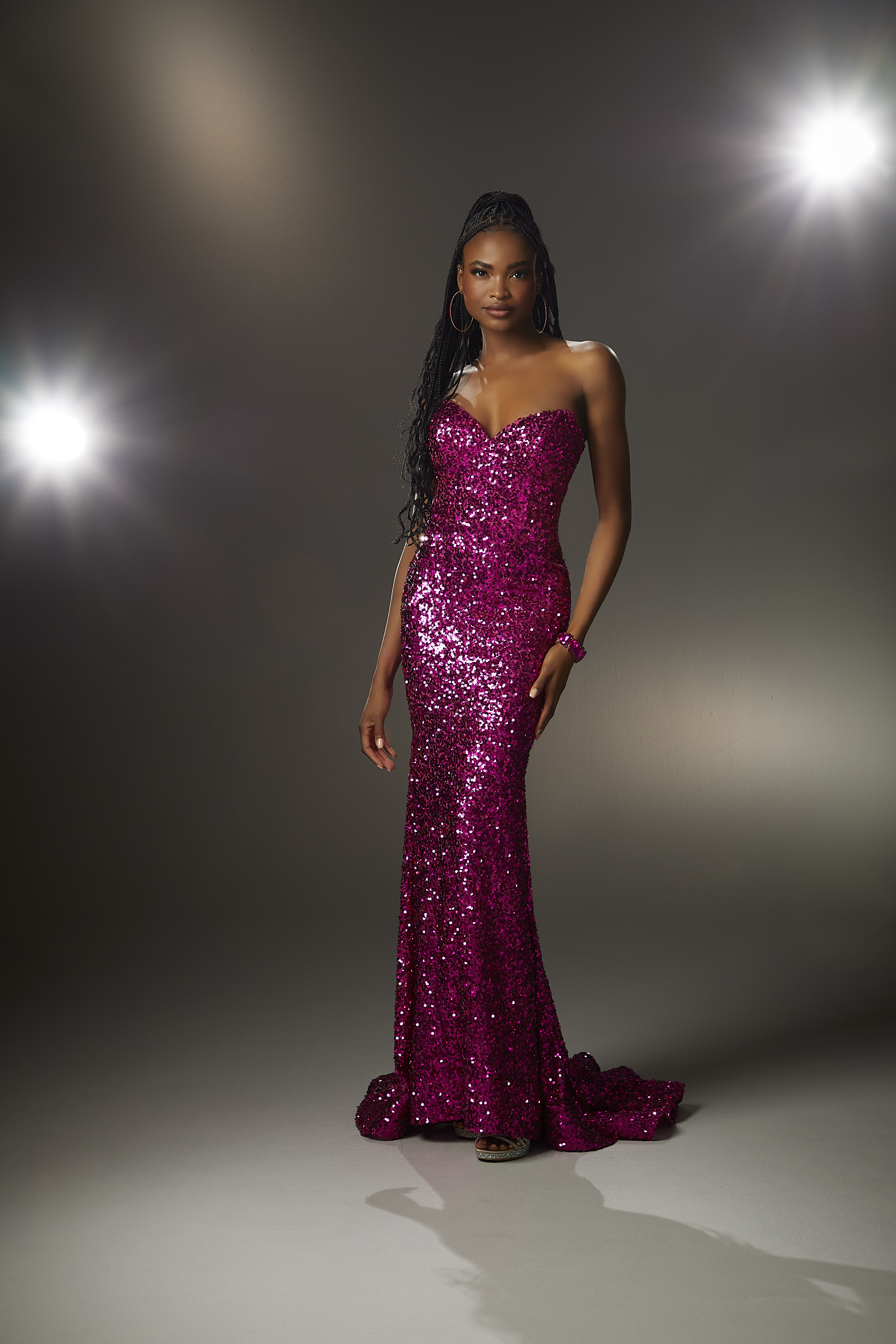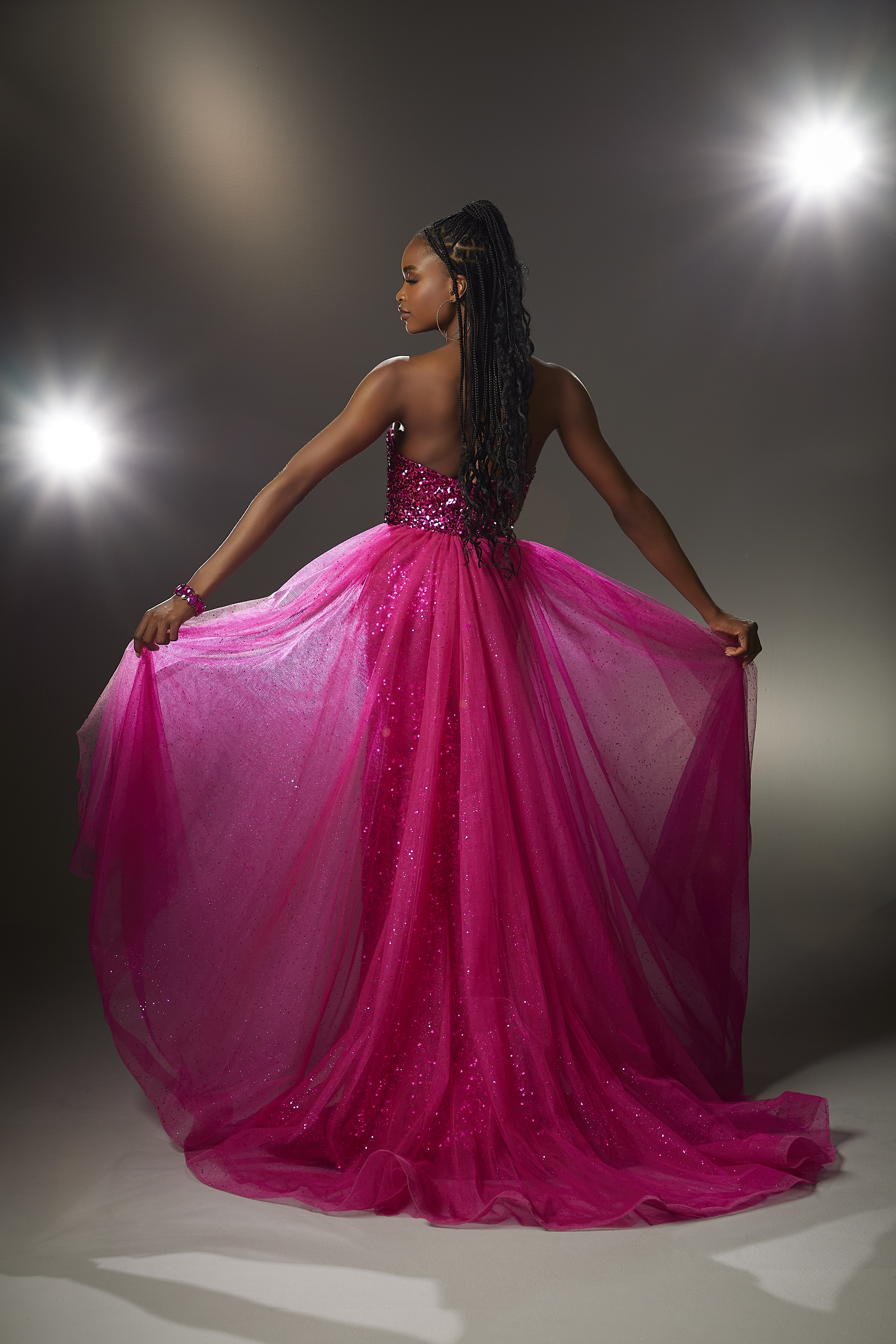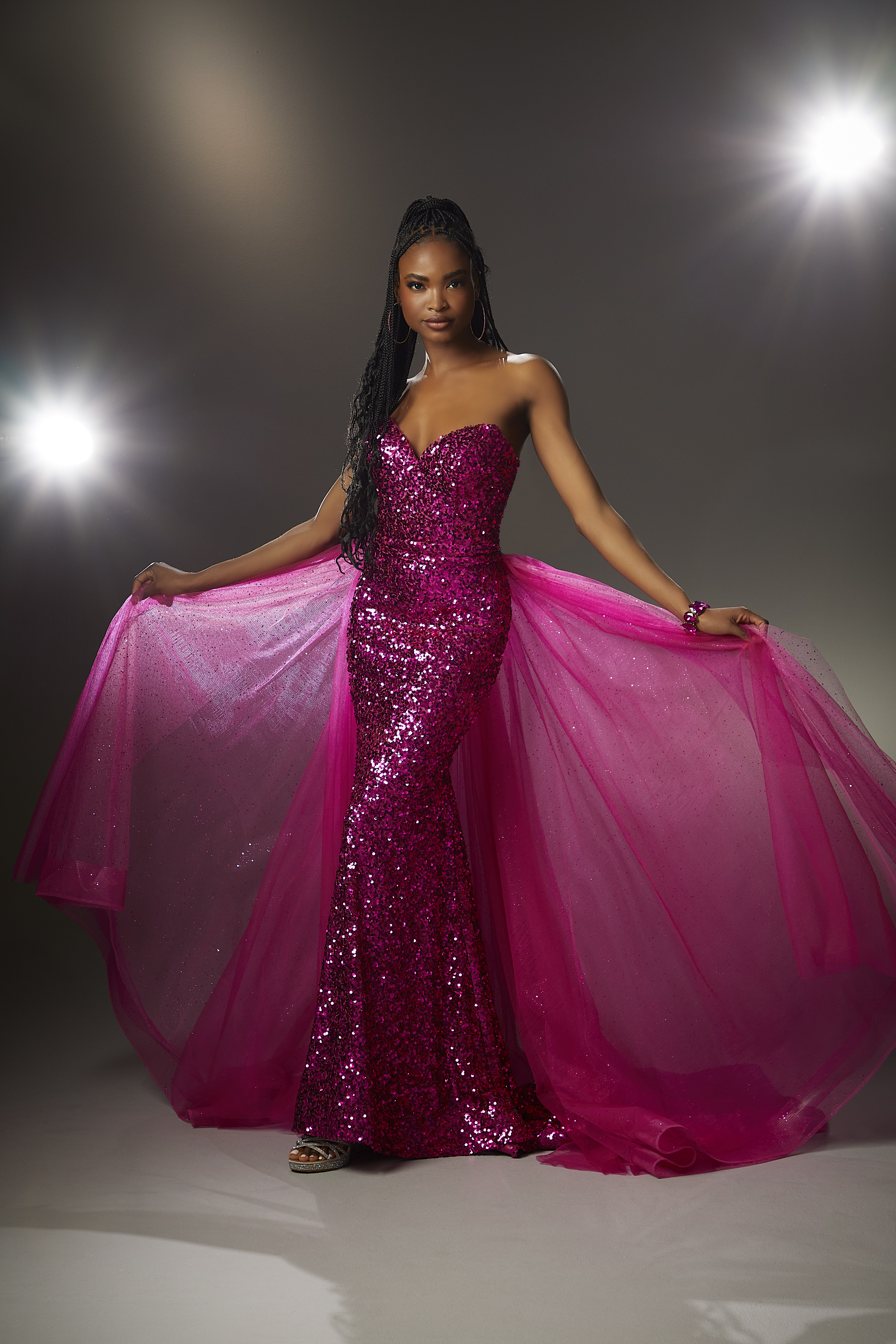 All-over Sequin Prom Dress with Detachable Overskirt. A dramatic prom dress in a classic fitted silhouette with a strapless v-neckline in glittering all-over sequin fabric. Pair the dress with the detachable glitter tulle overskirt to steal the show.