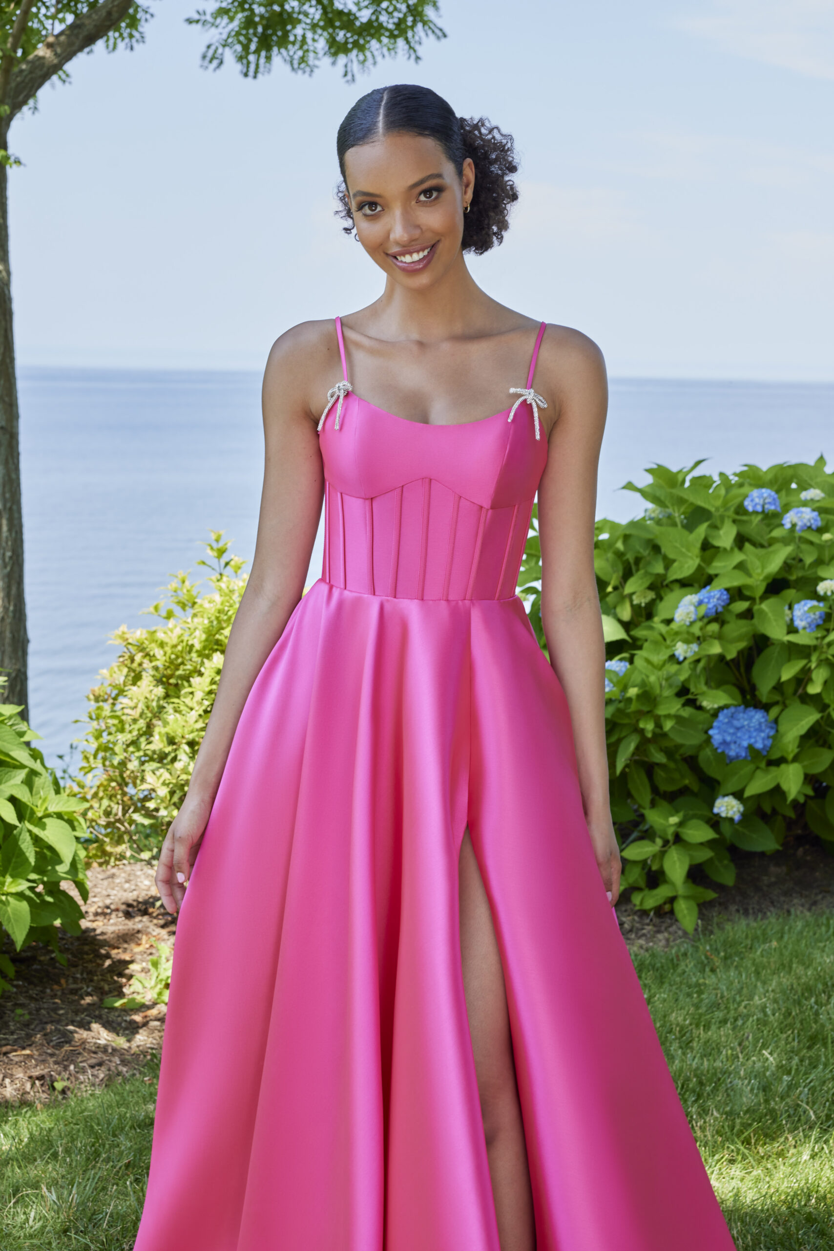 Morilee prom dress 49159 Chic ball gown prom dress has a scoop neck bodice with boning and crystal bows on a full Mikado skirt with slit.