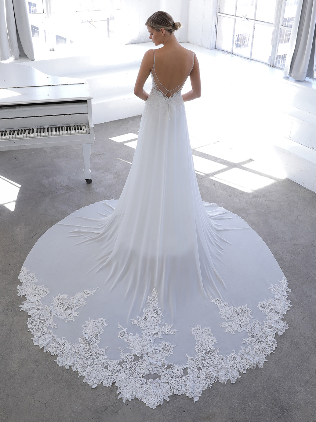 Novella 2021 Blue by Enzoani wedding dress is a very light chiffon A-Line. Its beautifully beaded straps lay on the sequined floral chantilly lace bodice. Novella gives your guests that captivating detail on the train. Novella is suitable for the lady who dreams of a modern, light weight wedding dress with an ultimate fit.